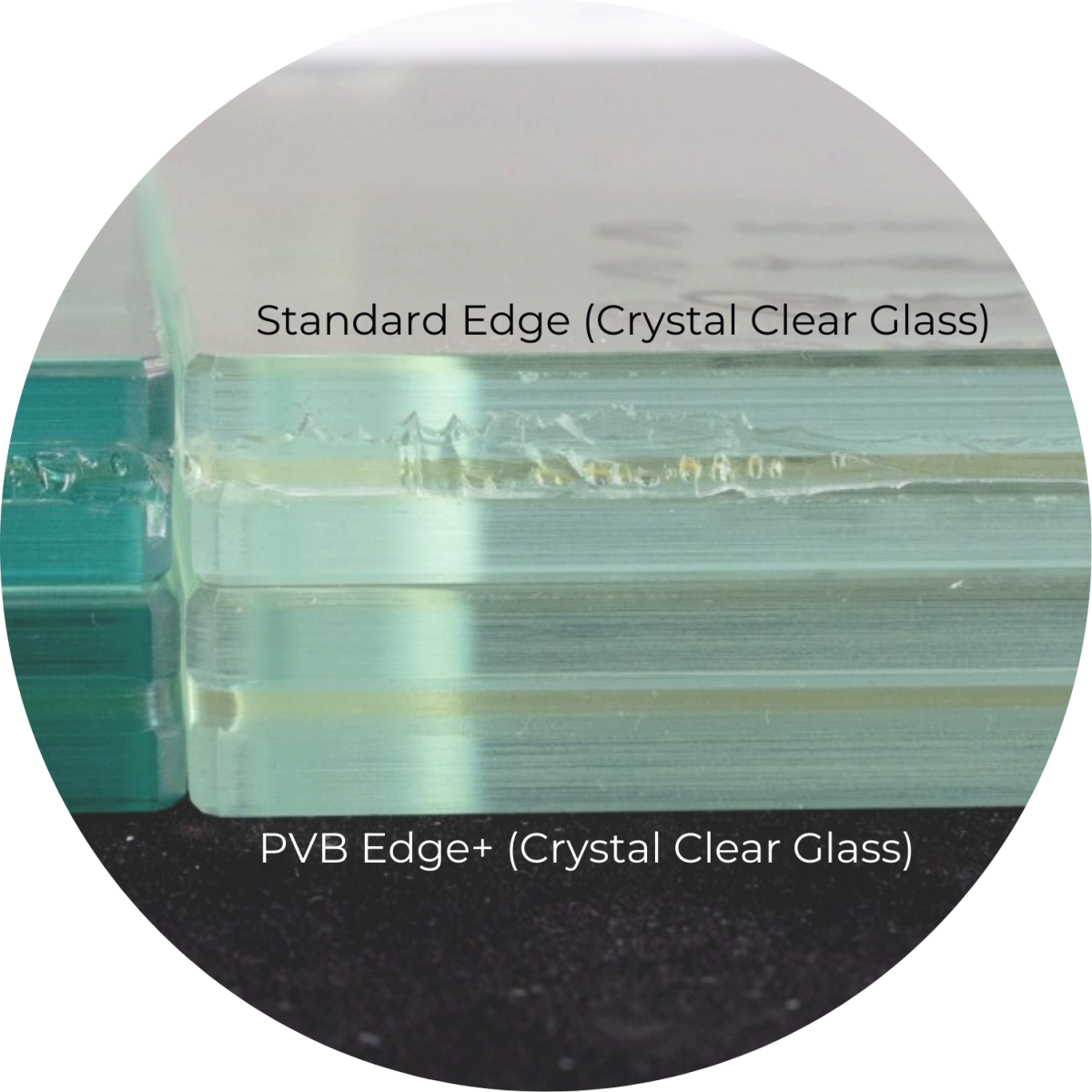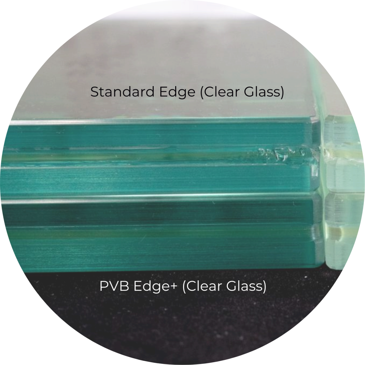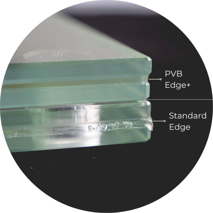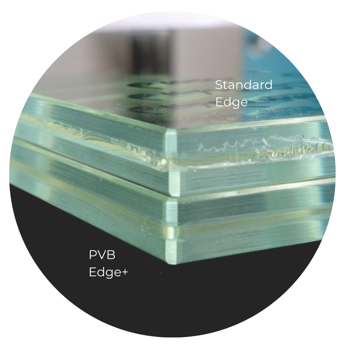 The PVB EDGE+ finish makes the laminated glass look like one piece, instead of 2 pieces of glass and 1 pieces of PVB. It gives a flush, glass like appearance to the edge. This finish looks amazing and is incredibly aesthetically pleasing. On applications where the edge is seen and is visually important, we recommend EDGE+
